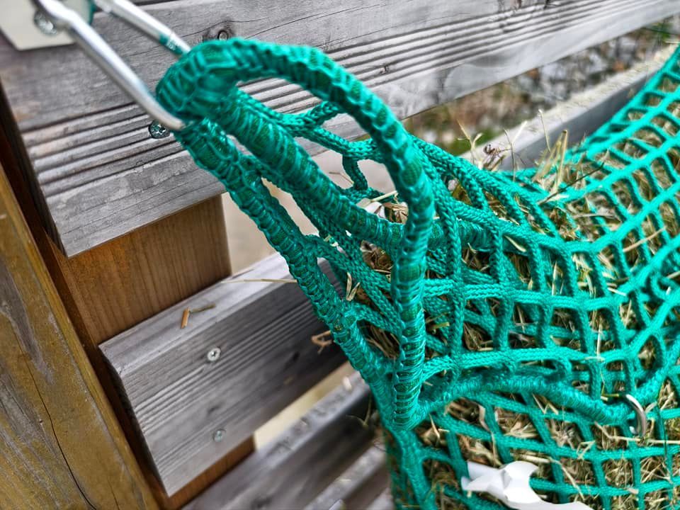 Wählt ihr eine Maschenweite von 4,5 cm, sollte euer Pferd bereits an Heunetze gewöhnt sein und mit dem Einsteigermodell (6 cm) sehr gut zurechtkommen. Die Fressmenge wird noch weiter reduziert.
